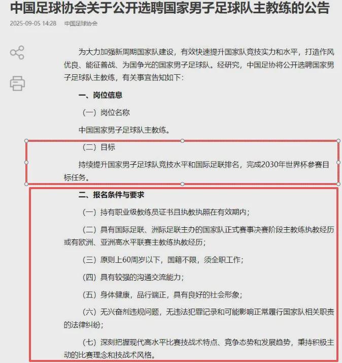 首先我们先来看下足协选聘新帅的硬性条件,身体健康,品行端正,年龄要在60岁以下,有大赛或者高水平联赛带队经验,最好是熟悉亚洲足球,愿意和足协通力合作,技战术打法符合现代化潮流。