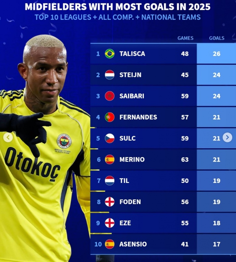 1月4日讯 《转会市场》统计了2025年前十联赛中场的俱乐部+国家队各项赛事进球最多情况,塔利斯卡居首。