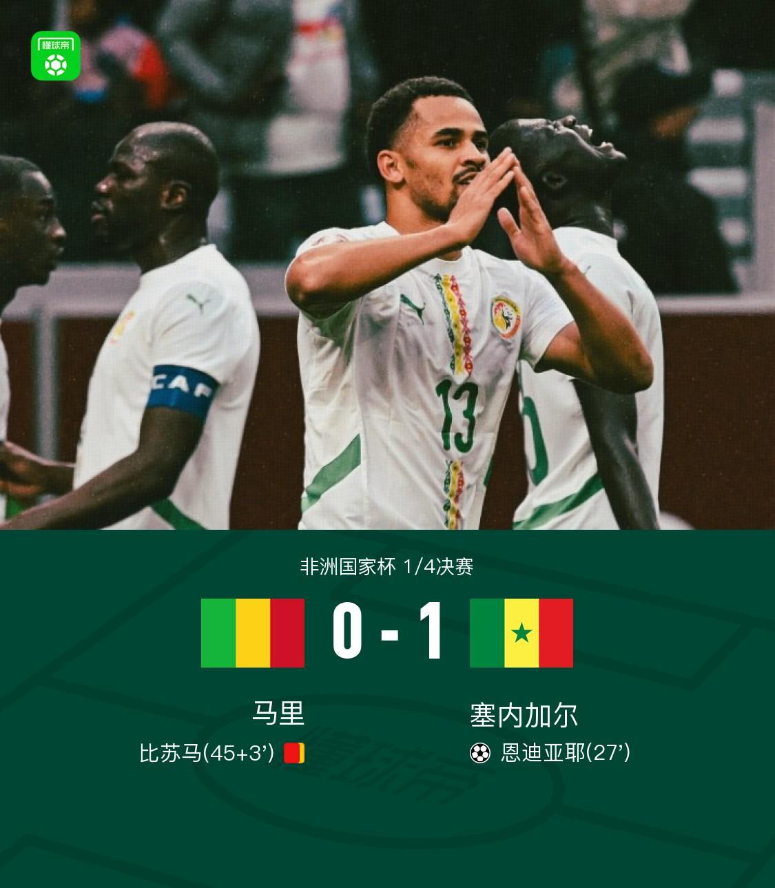 北京时间1月10日,非洲国家杯1/4决赛展开较量,马里迎战塞内加尔。比赛中,恩迪亚耶攻入全场唯一进球,为球队取得领先。上半场补时阶段,比苏马因累计两张黄牌被罚离场。凭借稳固的防守与高效的进攻组织,塞内加尔将优势保持至终场。最终,比赛结果定格在0-1,塞内加尔成功晋级。